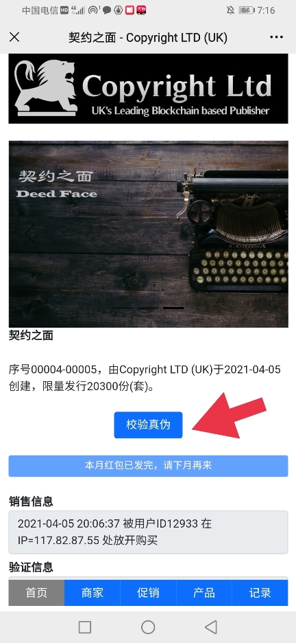 此时消费者可以点击校验真伪,系统会自动绑定该商品到其openID,当该用户再次扫描该码时,会显示如下(界面2):