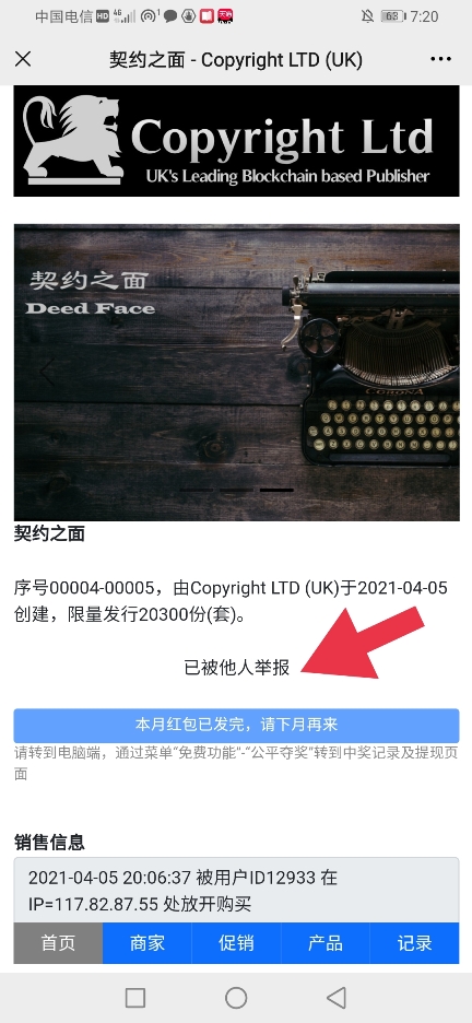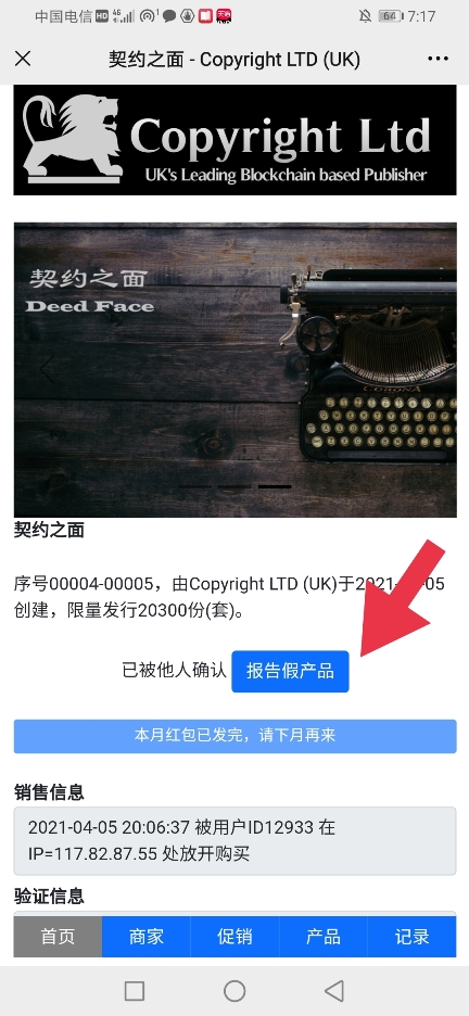 最后,也是本系统与其他防伪平台最大区别。此次上报的信息,不但会通知平台和商家,当第一个扫该产品码的消费者(非上报假产品者)再次扫码时,其界面会由界面2(正常状态)变为以下界面6,而其他所有消费者也一样,如有再次扫到该码的,都会显示以下界面: